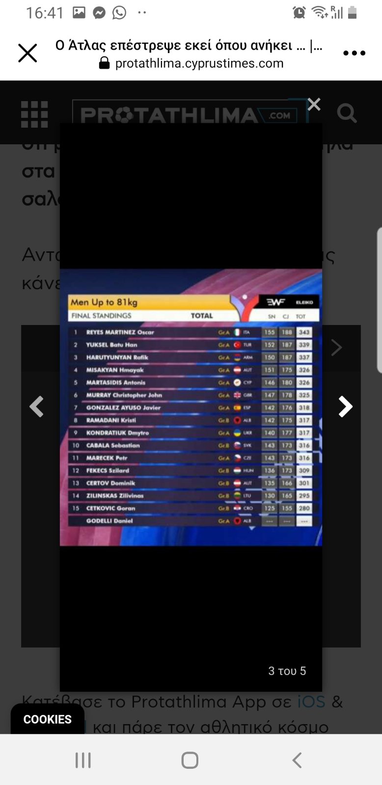 Η Κυπρική Ομοσπονδία Άρσης Βαρών ξανά στα ψηλά της Ευρώπης με τον Αντώνη Μαρτασίδη, μετά από ένα δραματικό αγώνα που έγινε στο Yerevan της Αρμενίας, ο αθλητής μας πήρε την 5η θέση στο σύνολο και την 4η θέση στο ζετέ.