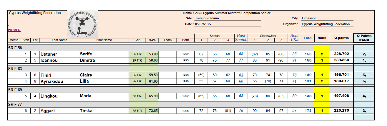 Με μεγάλη επιτυχία ολοκληρώθηκαν οι Παγκύπριοι Αγώνες Άρσης Βαρών Α’ Εξαμήνου, που πραγματοποιήθηκαν στις προσωρινές εγκαταστάσεις της Ομοσπονδίας Άρσης Βαρών στη Λεμεσό το Σάββατο 5 Ιουλίου 2025.